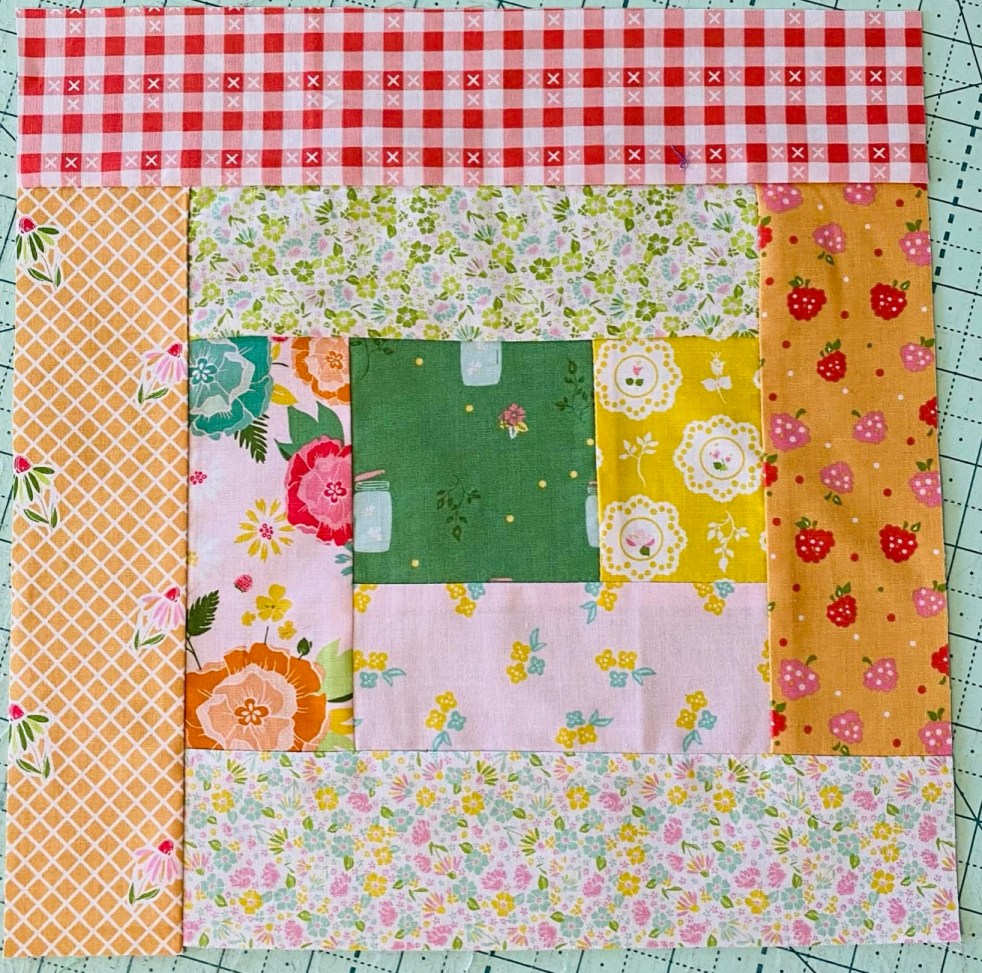 Log cabin blocks are very versatile and y to play with. They start with a centre and work around the centre with strips. You can start on the top, side or bottom, you can use the same width strips or strips of different widths. This one is a pretty standard.