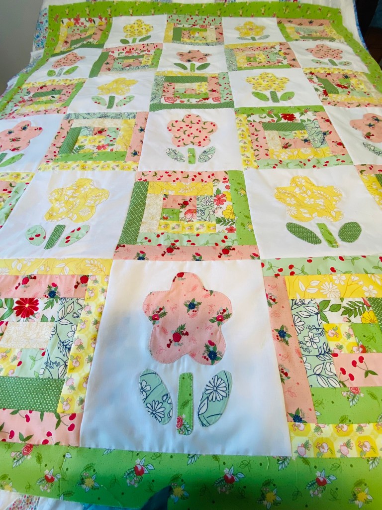 This quilt has been fun, its made with Reflections by Riley Blake. I loved all the prints but could not make a block I liked, I ended up trying a log cabin and voila! Loved it. To break it up I used a applique block taken from a pattern in the Cath Kidston book Sew! I have always wanted to use the sweet flowers in that quilt.