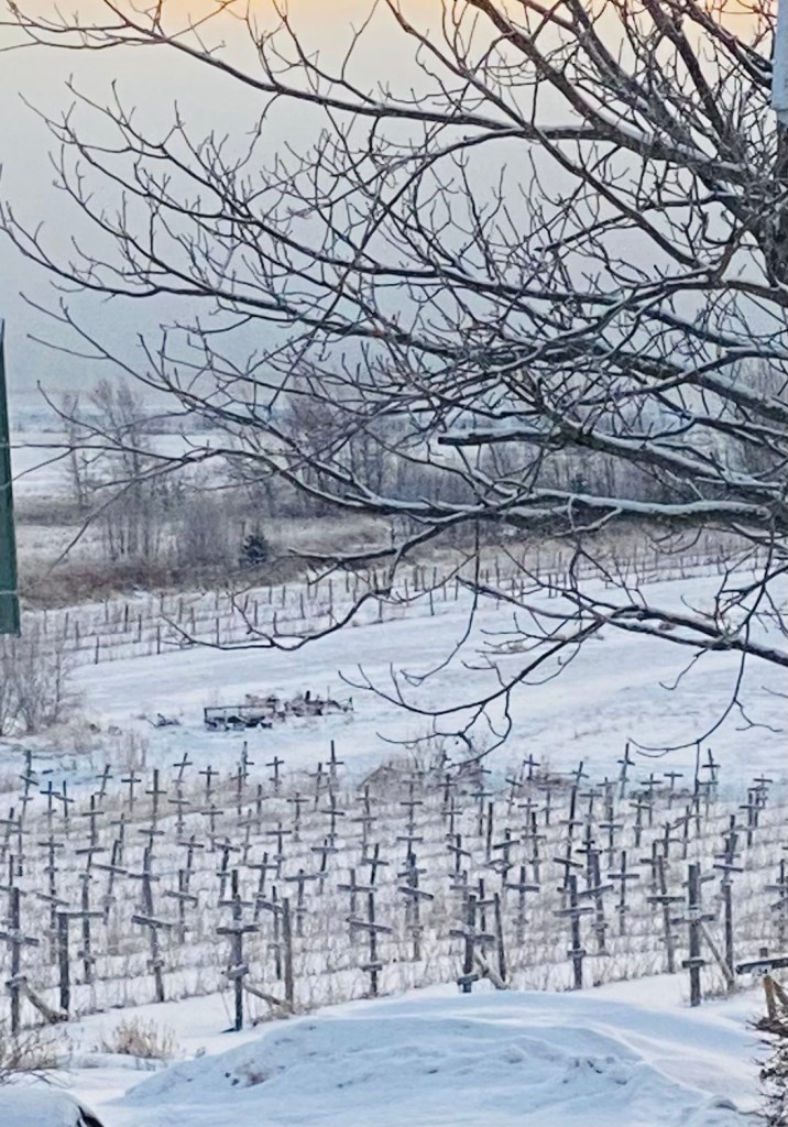 Once dawn broke it went from clear to super foggy over the river in seconds. The weather here is fascinating! Those are stakes for raspberries in case you were wondering what the crosses are.