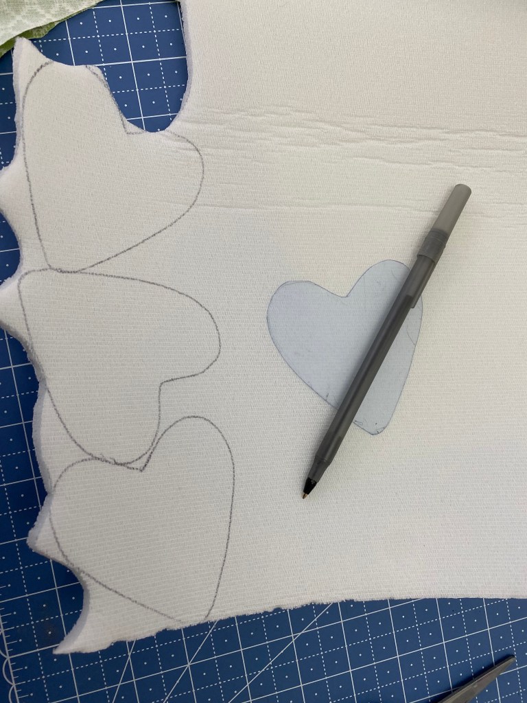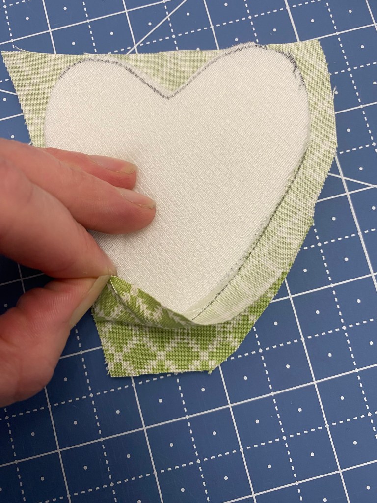 For the fabric: for simple shapes like hearts trace one side only and use a large enough scrap for the opposite side or fold it like shown here. For directional shapes like birds, trace two (one per side) by flipping the template before tracing. If need to add wings etc. do it before going on to the next step. Leave some room between the shapes