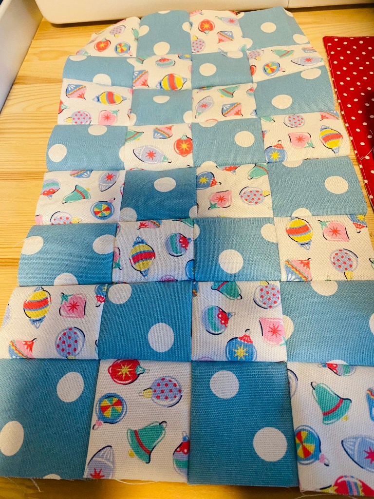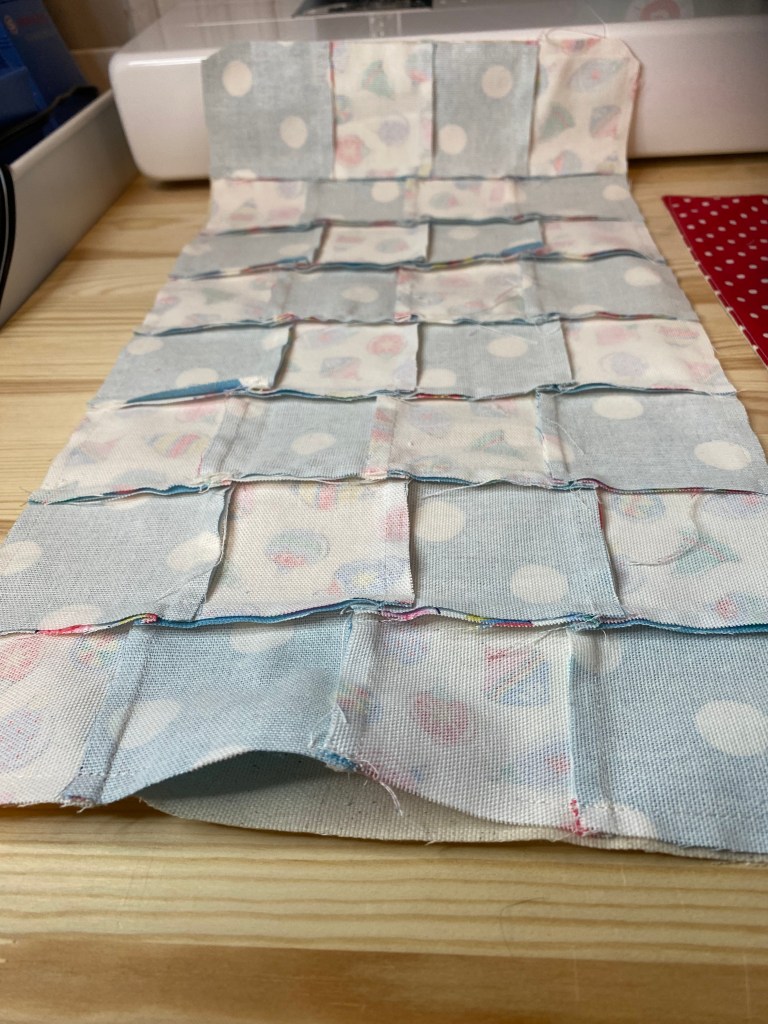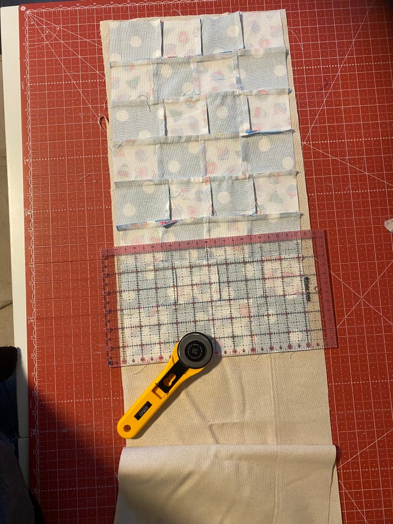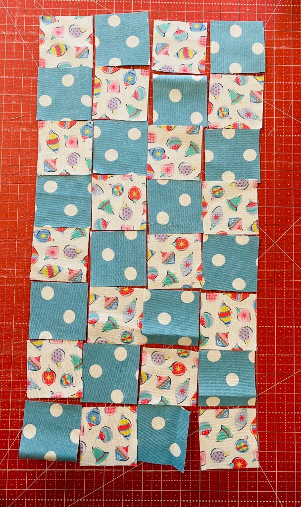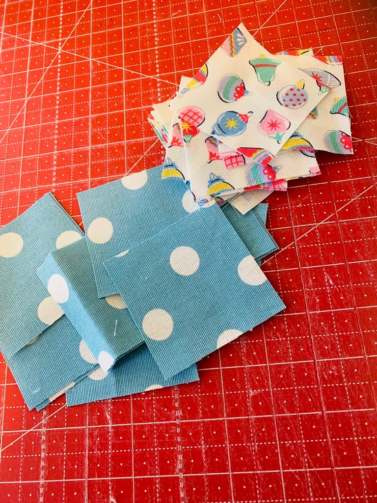 I figured 3 inch squares would make the most out of the material. I got 9 squares from a remnant, so I cut up two of them. I didn’t want to make it too big incase it didn’t turnout as my head figured it would. I cut 18 3 inch squares of the blue dots to match