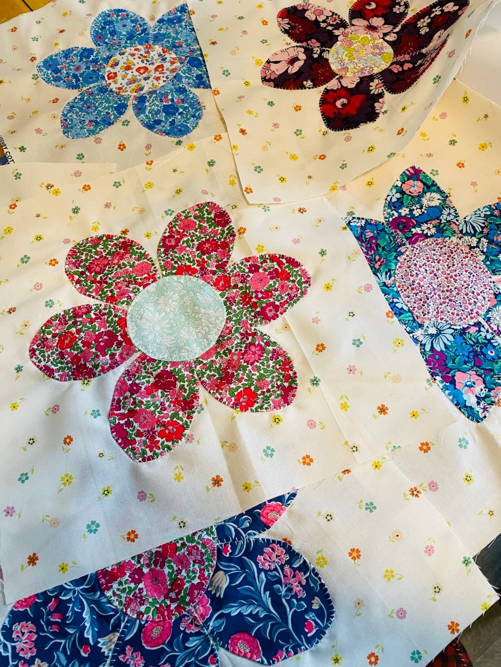 With the scraps from cutting out the flowers I’m making 3.5 inch squares with tiny flowers. I used the bondaweb method for those, too little to turn. I’m not a fan of this method as it looks so flat, But it uses up scraps. no plans for these square, just making them lol.